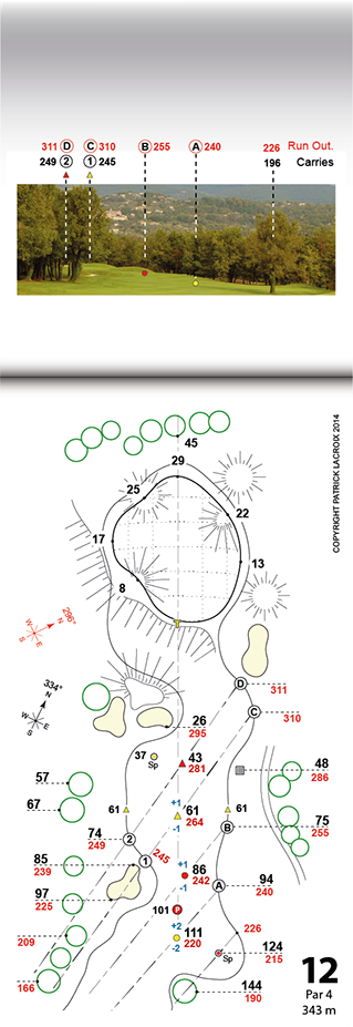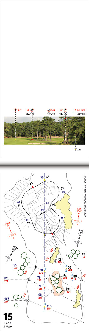 Indispensable sur les trous en dog-leg et les trous aveugles, la photo permet une lecture rapide des profondeurs de jeu ("Carries" et "Run Outs").
